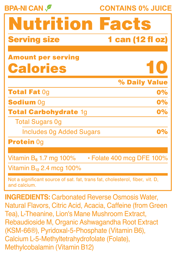 Carbonated Reverse Osmosis Water, Natural Flavors, Citric Acid, Acacia, Caffeine (from Green Tea), L-Theanine, Lion's Mane Mushroom Extract, Rebaudioside M, Organic Ashwagandha Root Extract (KSM-66®), Pyridoxal-5-Phosphate (Vitamin B6), Calcium L-5-Methyltetrahydrofolate (Folate), Methylcobalamin (Vitamin B12)